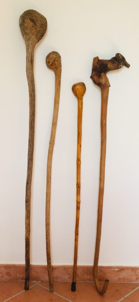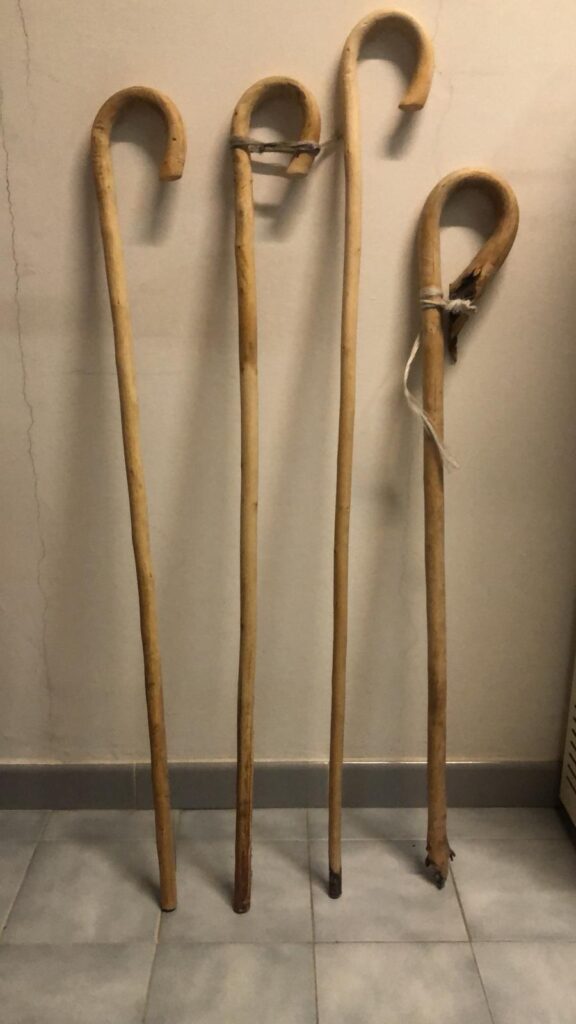 Il 20 ottobre 2017, nel castagneto in località Filette, a Pietraroja, m’imbattei in Antonio Cusanelli che, molto avanti negli anni e seduto davanti casa, filava spago; lo fotografai e mi confidò d’essere stato custode di pecore e di agnelli da quando aveva nove anni, al pari di coetanei, ed uno degli ultimi, nel 1970-‘80, a far transumanza in Puglia e d’avervi imparato, durante le soste, a confezionare “cisti re vinci” – cesti di vimini –, “funi e bastuni”.19Ref. A. Cusanelli, Pietraroja, 20 ottobre 2017, ore 12.30. Il 15 aprile 2023, da Anna Luisa Bello, di Pietraroja, ho ricevuto l’immagine di quattro “bastuni”, due con uncino legato al tronco in attesa della stagionatura; suo nonno, Antonio Cusanelli, domiciliato in località Filette, li aveva tratti da germogli di castagno, flessibili eppure resistenti, per uso personale e per doni eventuali.20A.L. Bello, 15, 4, 2023, ore 14,32 e tel. pass.