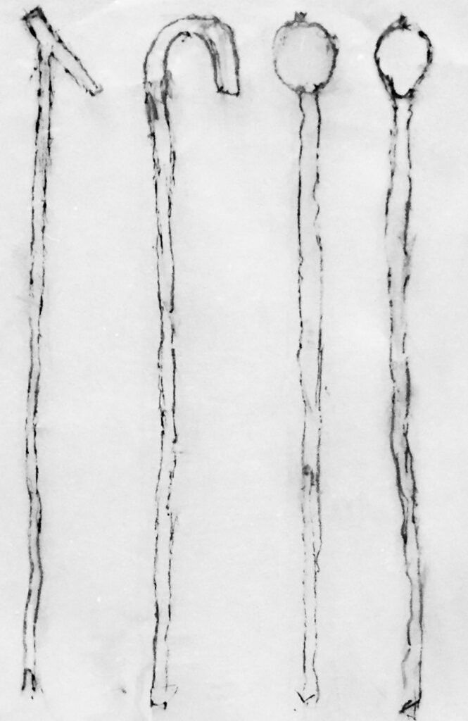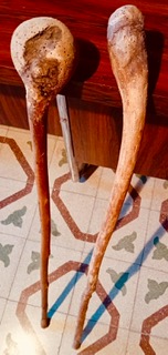 Il 10 marzo 2025, sempre Anna L. Bello mi ha inviato due foto dei bastoni collezionati, datele da Lucia Falcigno; una di esse mette in evidenza una “mazzocca”, portata a compimento con testa grossa e tondeggiante, purtroppo corrosa, e una forma, approssimativa, forse di “pirocca”.21A.L. Bello, ref. con foto, per iPhone del 10,3, 2025, ore 17,12.