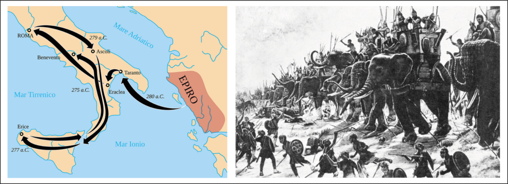 La storia narra che, intorno al 280 a.C., quando Taranto tentò di arginare l’espansionismo romano – e nella consapevolezza di non poter competere con l’esercito romano – invitò Pirro a capeggiare l’impresa.1Pirro (318-272 a.C.), fu re e condottiero dell’Epiro, una regione situata approssimativamente tra l’odierna Albania meridionale e la Grecia nord-occidentale. Il re dell’Epiro acconsentì prontamente e i Sanniti si ritrovarono quasi autonomamente a divenire suoi alleati.2E. T. Salmon, Il Sannio e i Sanniti, Einaudi, Torino, 1985, p. 301.