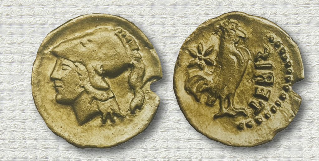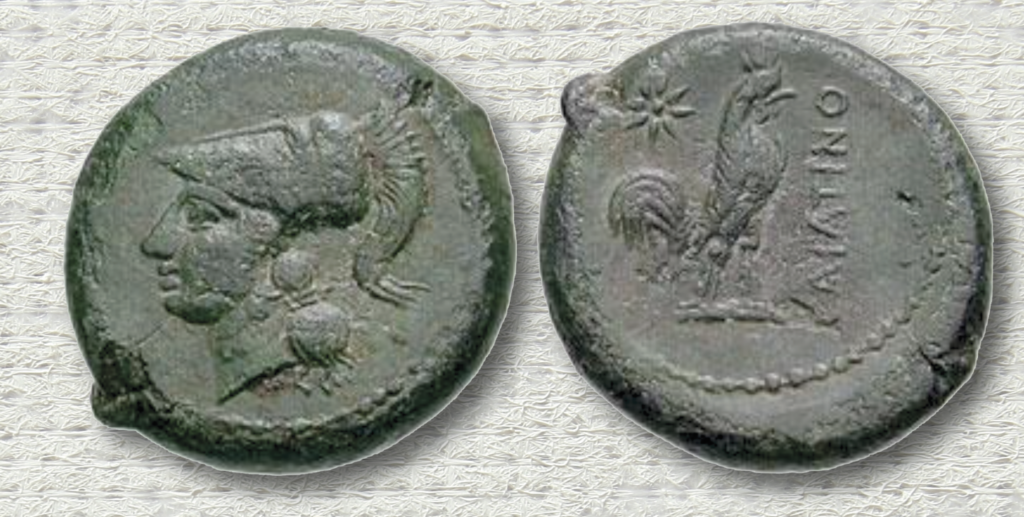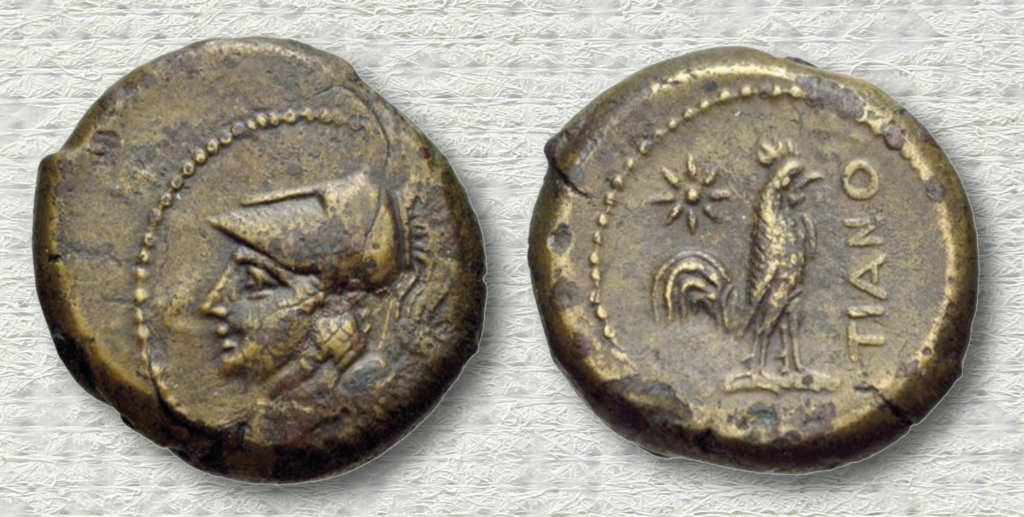 Molto frequente, infine, sulle monetazioni delle colonie latine della prima età del III sec. a.C., è la figura di Pallade/Atena, così come l’immagine ricorrente del gallo, emblema della vigilanza, del legame con il mondo contadino e della forza nel difendere il proprio territorio.
