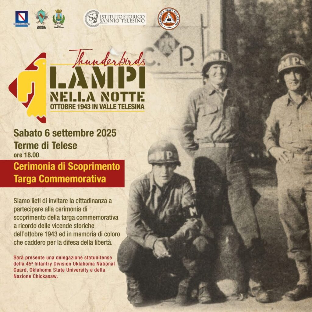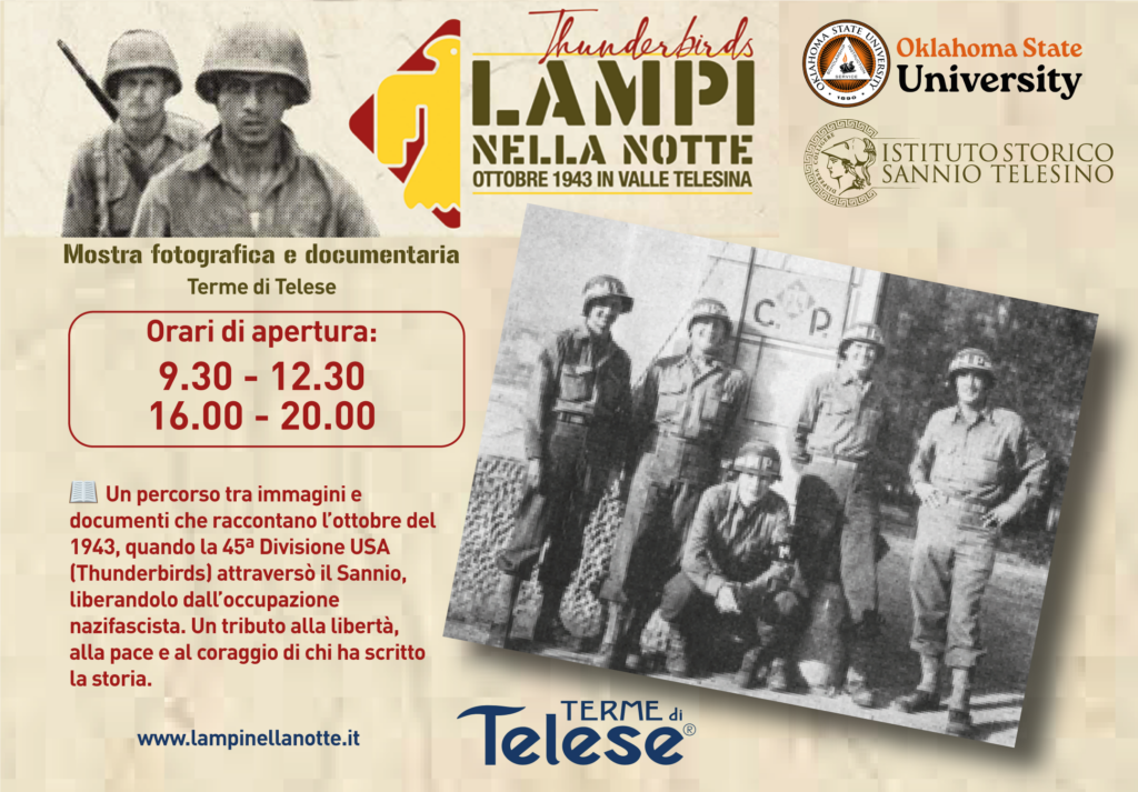 «Lampi nella Notte» è una mostra fotografica e documentaria nata dalla collaborazione tra l’Istituto Storico Sannio Telesino e l’Università Statale dell’Oklahoma. È un progetto di memoria collettiva che restituisce dignità alla storia della Valle Telesina durante la Seconda Guerra Mondiale. Attraverso fotografie inedite, il percorso espositivo racconta un paesaggio segnato dalla guerra, trasforma i luoghi in protagonisti vivi della narrazione storica ed offre spunti di approfondimento storico e culturale. L’allestimento, pensato come dispositivo sensoriale e narrativo, guida il visitatore in un viaggio emotivo e coinvolgente, dove le immagini non si osservano soltanto, ma si vivono. La mostra offre un’esperienza coinvolgente e documentata, che permette di rivivere i giorni drammatici e cruciali che portarono la liberazione dell’Italia dal nazifascismo. È un percorso visivo che unisce storia locale e memoria collettiva, restituendo voce ai luoghi e ai volti di un tempo che non va dimenticato.